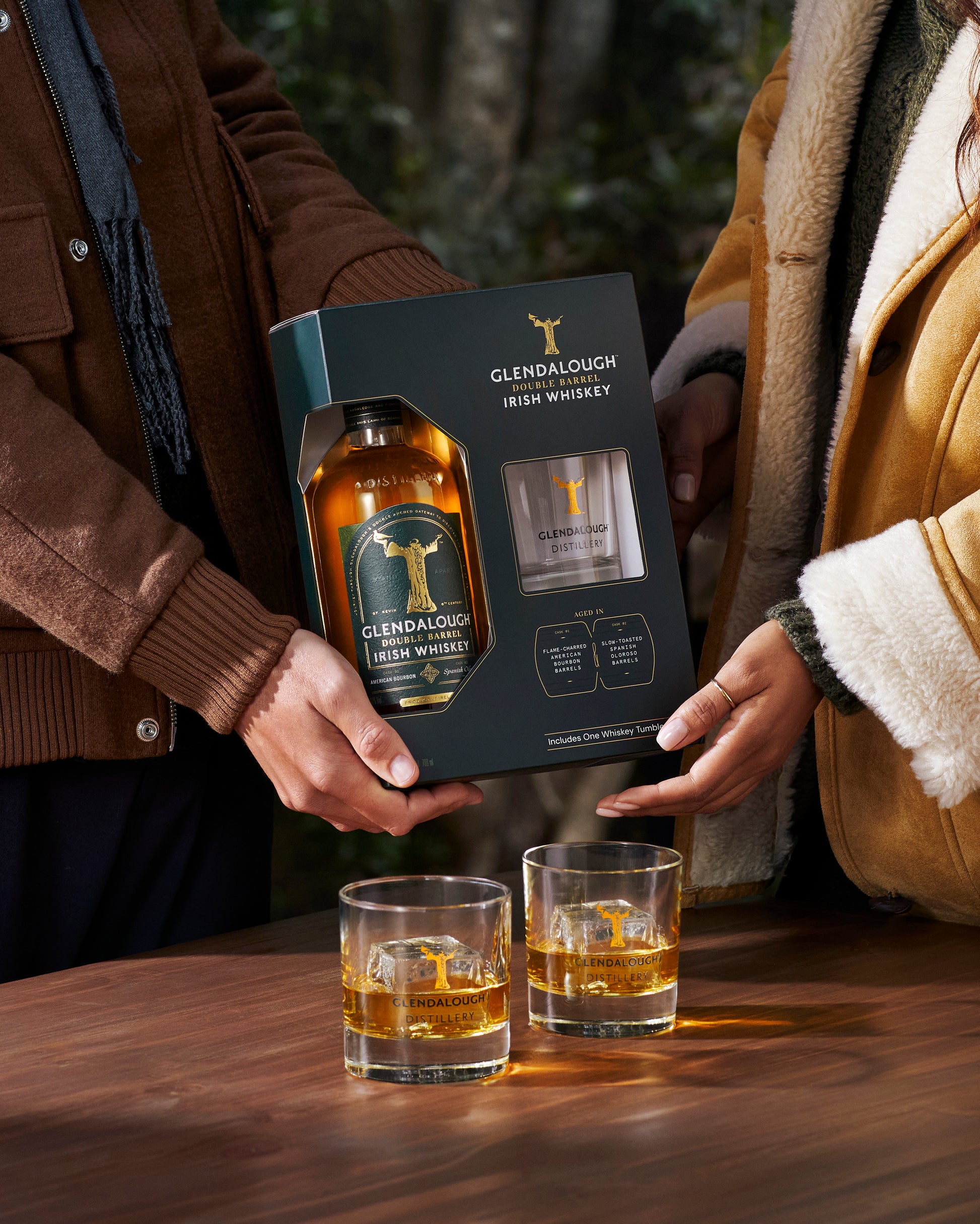 Features one bottle of Double Barrel and one Glendalough branded whiskey tumbler
